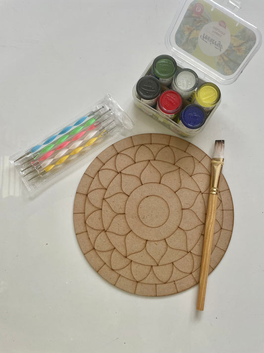 Paint Cafe Mandala dot painting pre marked art kit includes 8inch mdf board, paint, brush, dot tools.
